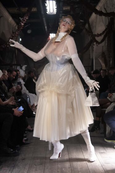 John Galliano is still at the helm of Maison Margiela, and Kim Kardashian attended the show, which means that — between her love of Dolce & Gabbana, her Balenciaga loyalty and just-announced ambassadorship, and this — her taste in Designers Who Are Questionable At Best remains consistent. I’m not entirely sure what Gwen Christie is doing there. Relieving boredom? Scratching a lifelong itch to wear a repurposed shower curtain liner? Hoping no one will recognize her? All of the above?!?