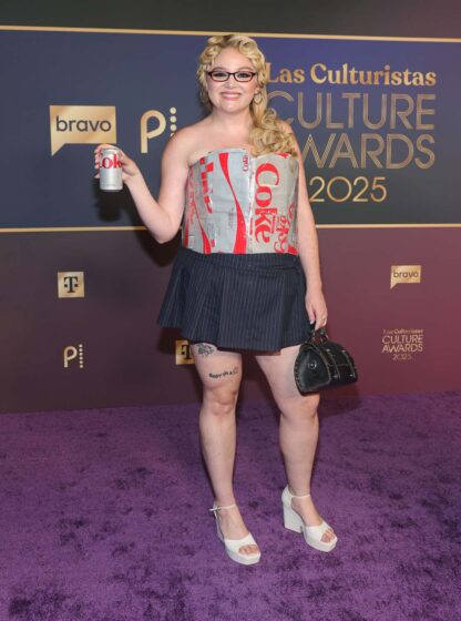 Las Culturistas is Bowen Yang’s podcast with his pal, comedian Matt Rogers, and they announced some tongue-in-cheek awards this year — stuff like Most Iconic Building, Kindest Greeting, Social Change Moment of the Year (“When a gay celebrity writes a children’s book”), Walking Home Alone Award For What Women *Have* To Do (“Just go talk to him to make sure he’s okay” and “Learn about Toxic Shock Syndrome and then worry about it until you die”). I didn’t realize they were also planning a whole EVENT for them. Foolish me! Don’t worry — everyone treated it with the UTMOST of seriousness, beginning with Meg Stalter, whose bodice is made out of empty Diet Coke boxes and who carried a fridge cigarette (my new favorite slang term) for good measure.