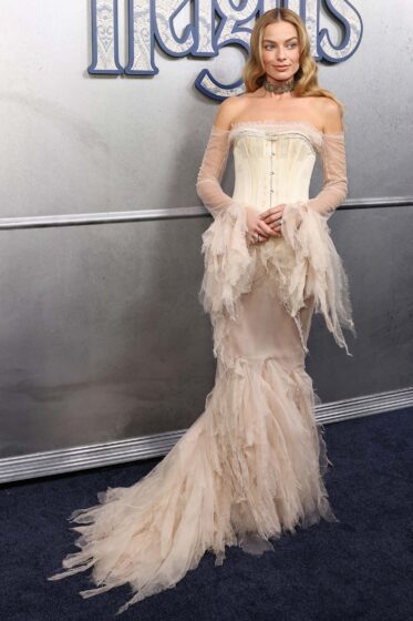 I can see where Margot and her stylist are trying for something cohesive here across the premieres — gowns that feel romantic and big, or outfits that seem slightly unstuck in time, maybe, or in this case, two outfits with mangy fringe. That one was vintage. What’s this one’s problem?